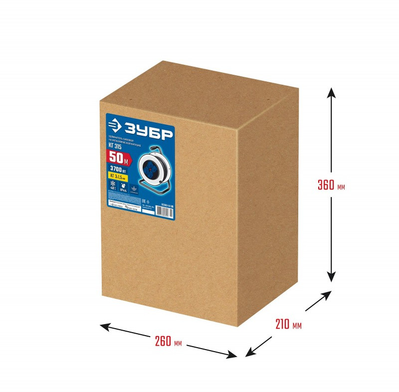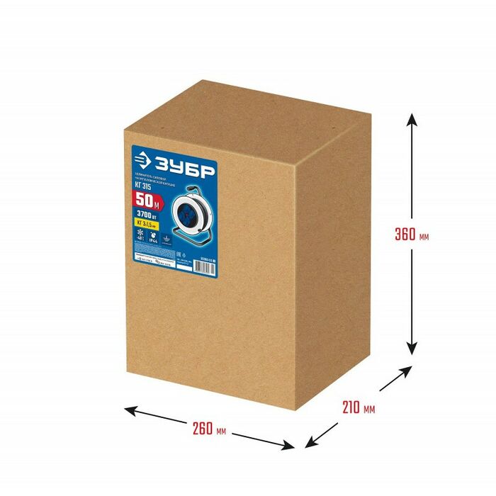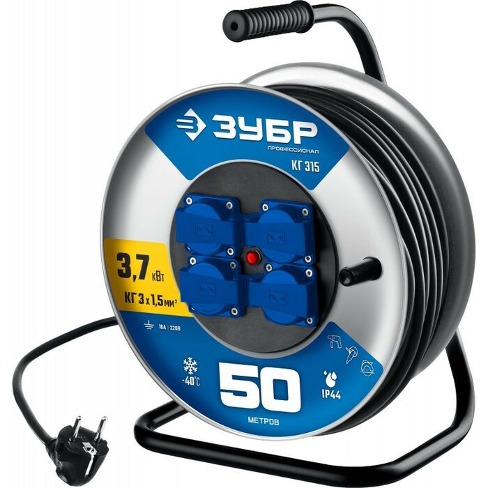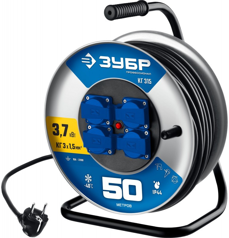 Силовой удлинитель на стальной катушке Зубр Профессионал КГ-315 КГ, 3 x 1.5 мм2, 50 м, 3700 Вт, IP44 [55080-50_z01]