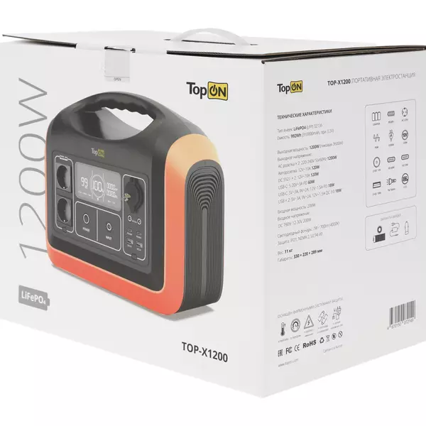 | Особенности | LiFePO4 ячейки суммарной емкостью 992Wh (310000mAh, при 3.2V). Выходная мощность 1200W, пиковая 3600W. 9 выходных интерфейсов для различной техники. 2 USB Type-C PD 60W/18W и 2 независимых USB QC 3.0 18W. Удобное и простое управление, цветной 5" LCD экран с подсветкой. |