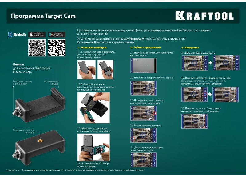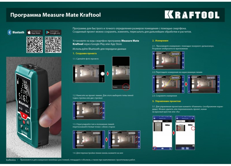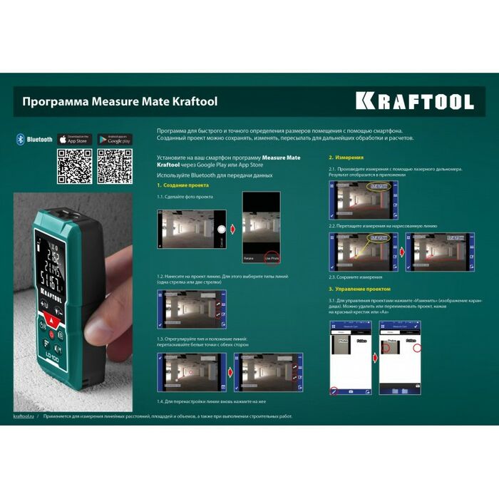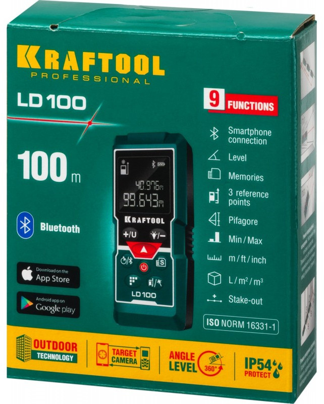 Профессиональный лазерный дальномер Kraftool - высокоточный прибор для быстрого и простого измерения линейных расстояний, площадей и объёмов. Позволяет проводить весь цикл измерений одному человеку, значительно ускоряя выполнение разметочных работ и повышая точность полученных данных.. Позволяет создавать дизайнерские проекты напрямую в вашем смартфоне. Возможность использования камеры смартфона в виде видоискателя.