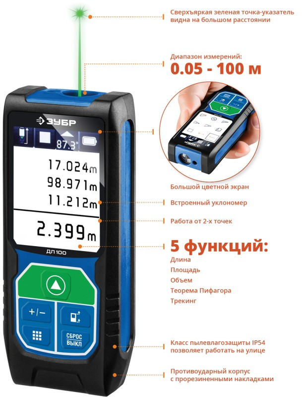 - Лазерный дальномер это высокоточный прибор для быстрого и простого измерения линейных расстояний, площадей и объёмов с помощью хорошо видимого луча зелёного цвета. Позволяет проводить весь цикл измерений одному человеку, значительно ускоряя выполнение разметочных работ и повышая надёжность полученных данных. Лёгкое считывание информации благодаря яркому цветному экрану.