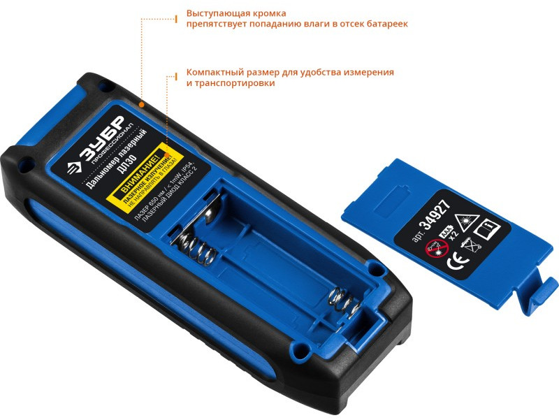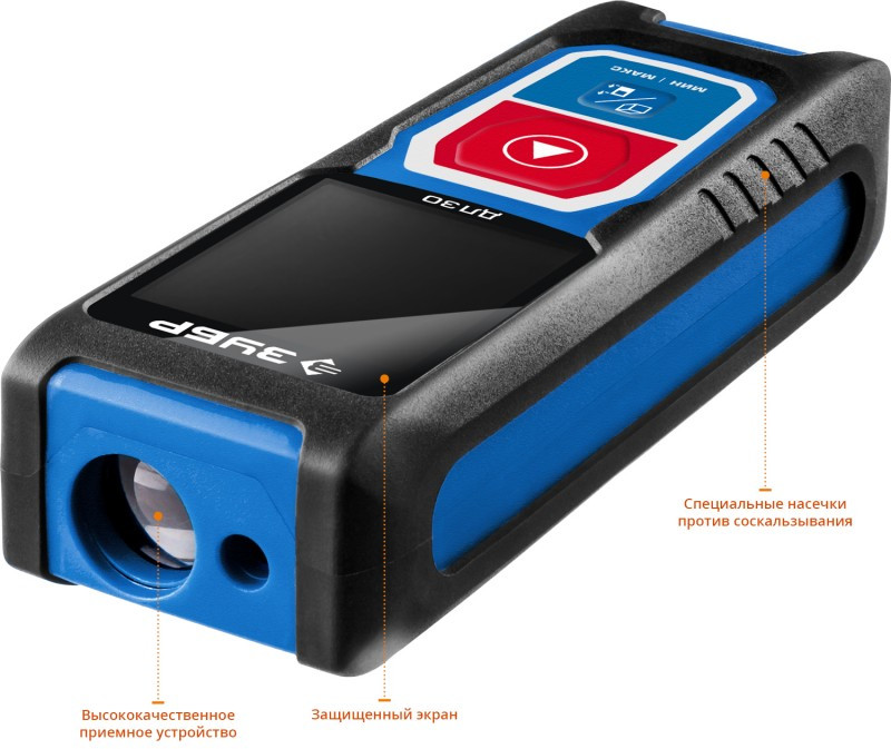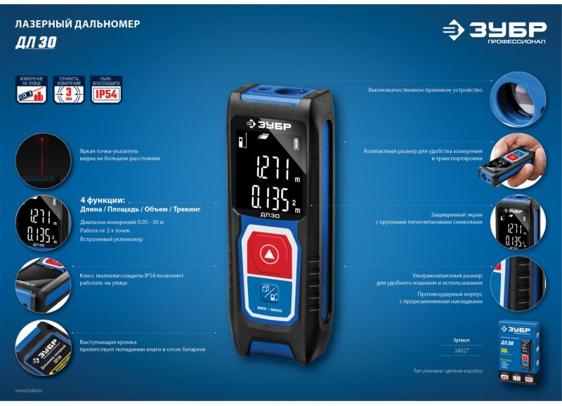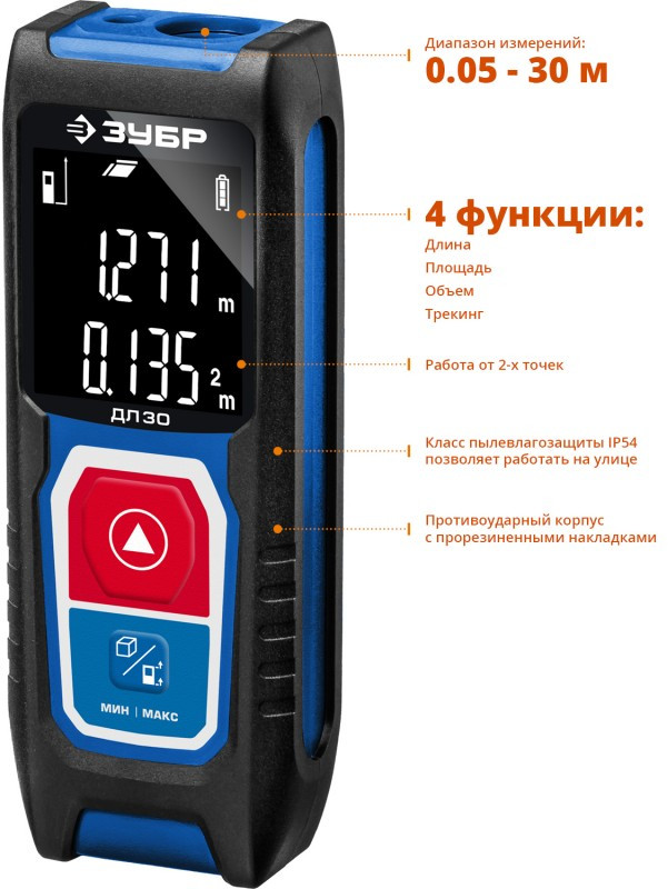 Лазерный дальномер Зубр Профессионал ДЛ-30 точность 3мм, дальность 30м, класс защиты IP54 [34927]