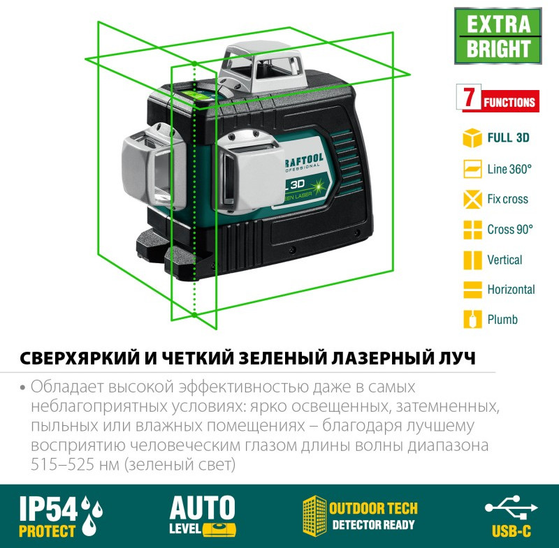 - 3 режима проецирования линий: горизонтальная и две вертикальные линии с развёрткой 360°, благодаря чему луч будет виден в любой точке.