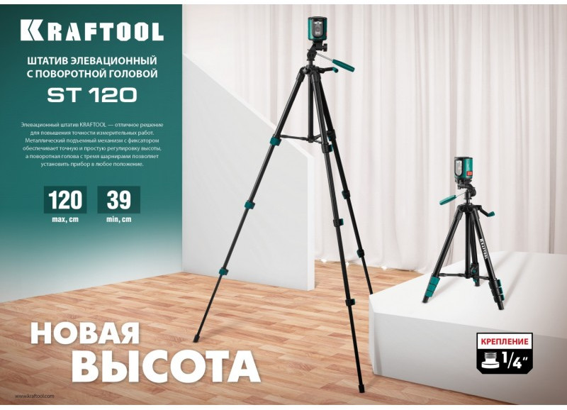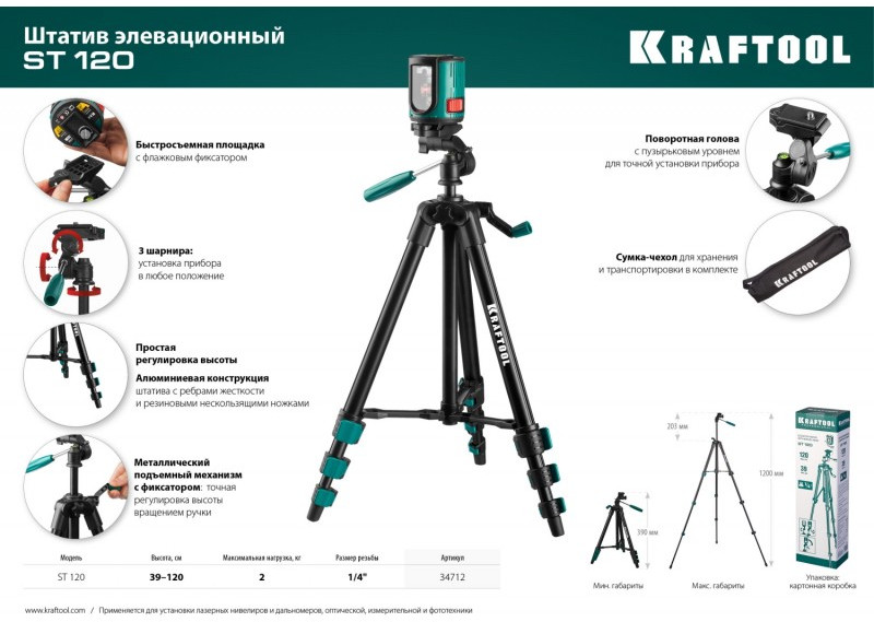 Профессиональный аксессуар для работы с лазерным, оптическим и фотоинструментом.Прибор можно точно установить на нужной высоте при помощи выдвижной колонки. Выполнен из алюминиевого сплава, благодаря чему имеет небольшой вес. А за счёт малого размера штатив легко носить и легко с ним работать.
