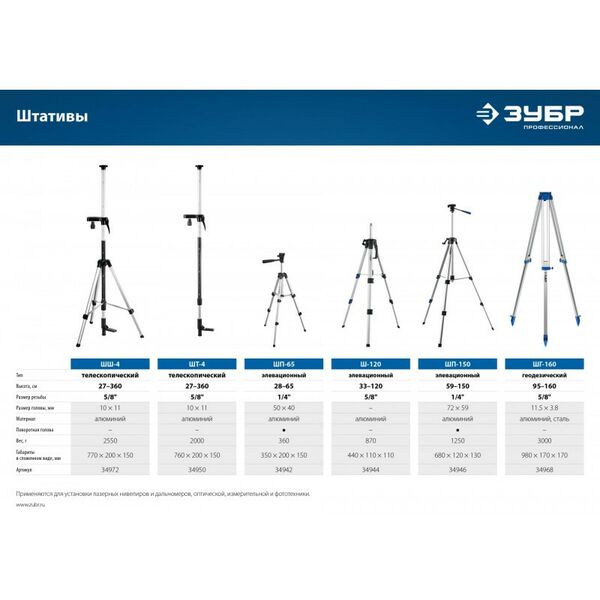 Профессиональный аксессуар для работы с лазерным, оптическим и фотоинструментом. Прибор можно точно установить на нужной высоте при помощи выдвижной колонки. Выполнен из алюминиевого сплава, благодаря чему имеет небольшой вес. А за счёт малого размера штатив легко носить и легко с ним работать.