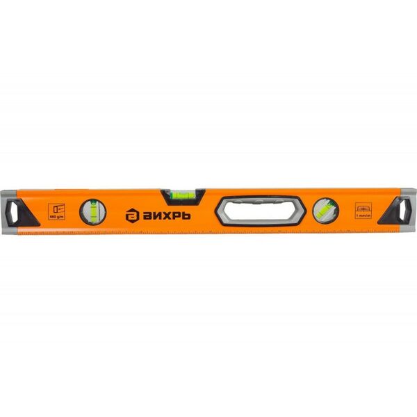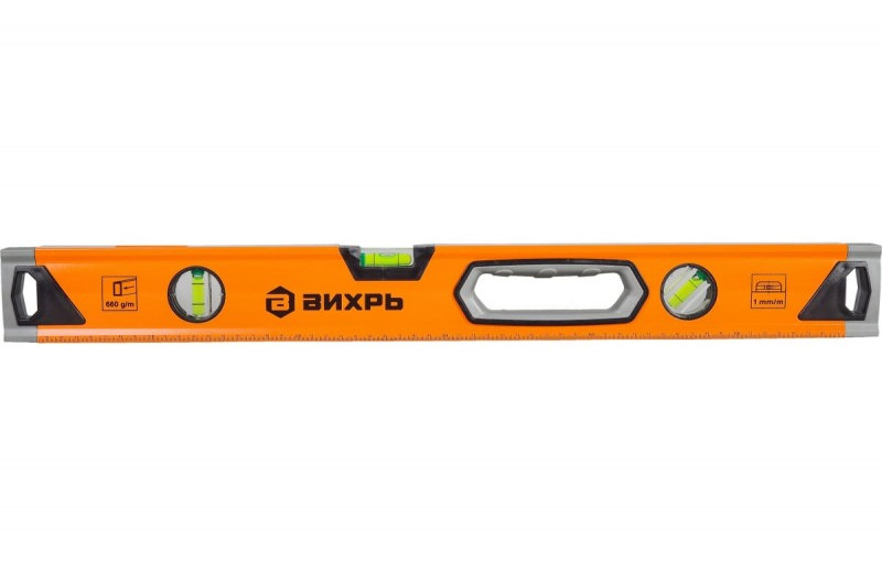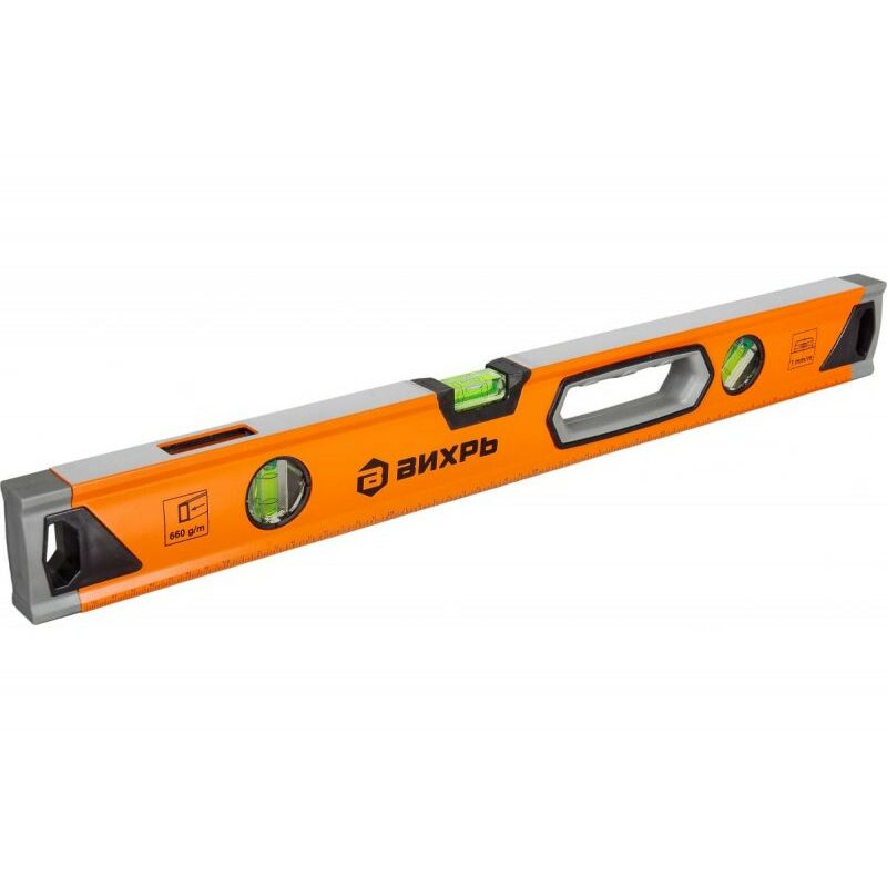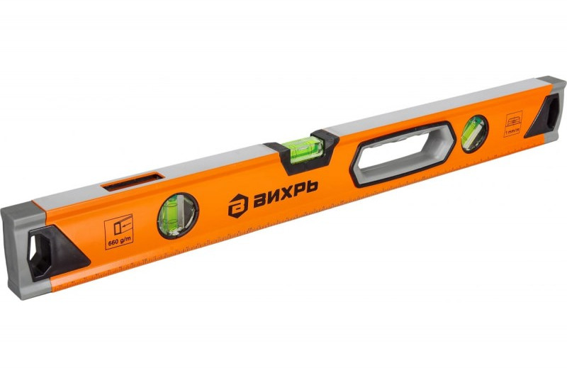 - Уровень алюминиевый "Усиленный" 600 мм, магнит, 3 глазка (1 зеркальный), 2 комп.рукоятки Вихрь - измерительный инструмент при строительных, ремонтных и отделочных работах для поиска и исправления отклонения поверхностей. Корпус прочный и износостойкий, изготовлен из алюминия. Фрезерованная рабочая поверхность служит для уменьшения возможной погрешности при измерениях. Длина уровня 600 мм.
