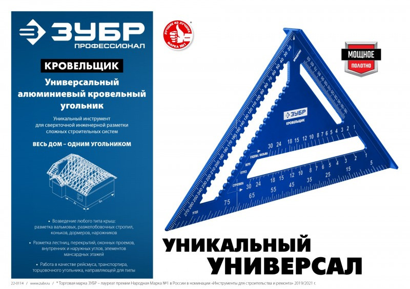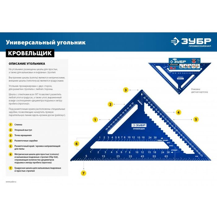 Универсальный кровельный угольник инструмент для точного определения расстояния в диапазоне от 0 до 300 мм. Может применяться в качестве торцовочного угольника, транспортира, рейсмуса и направляющей для пилы.