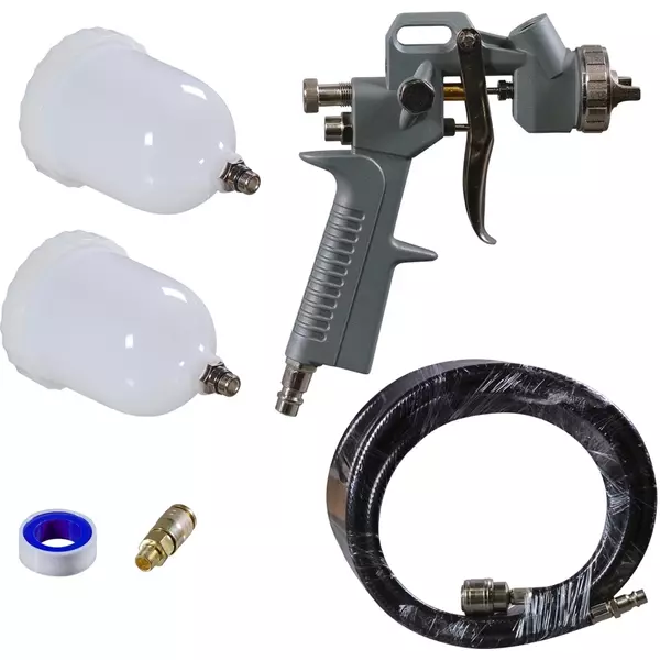 КомплектацияКомпрессор, краскораспылитель, сменный бачок 0,6 л, сопло 2,5 мм., воздушный шланг 10 м.