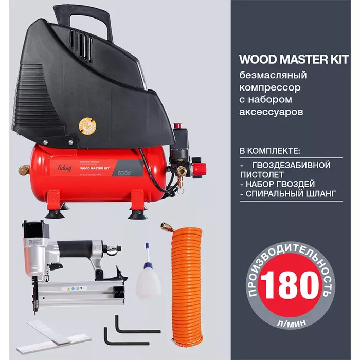 WOOD MASTER KIT - компрессорный набор, полностью готовый для проведения крепежных и других работ по дереву, а также различных работ по изготовлению и ремонту мебели и деревянных конструкций. Безмасляный компрессор, производительностью 180 л/мин и ресивером 6 л, выдает чистый воздух без примесей.