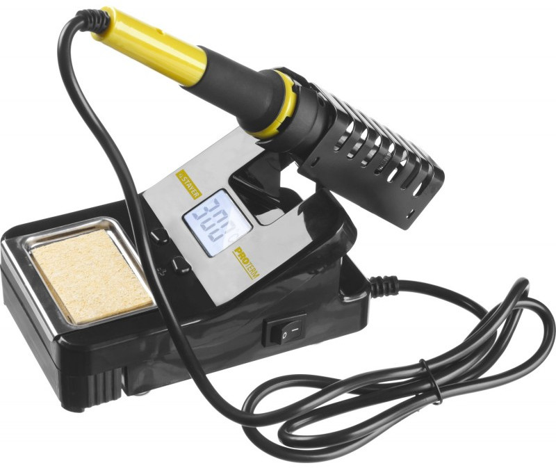 • Паяльная станция применяется для паяльных работ, требующих бережную пайку при определенной температуре. Станция особенно удобна при пайке электронных плат и других мелких деталей, поскольку поддерживает заданную температуру и не нуждается в отключении от электросети во время работы. Температура устанавливается с помощью кнопок, отвечающих за увеличение/уменьшение температуры. На ЖК-дисплее отображается процесс нагревания/остывания и температура жала паяльника. Выключатель обеспечивает удобство эксплуатации паяльной станции. В станции предусмотрен отсек для очистки жала от припоя. Подставка, поставляемая в комплекте, удобна при выполнении паяльных работ и обеспечивает безопасность.