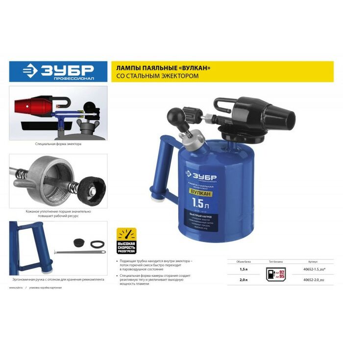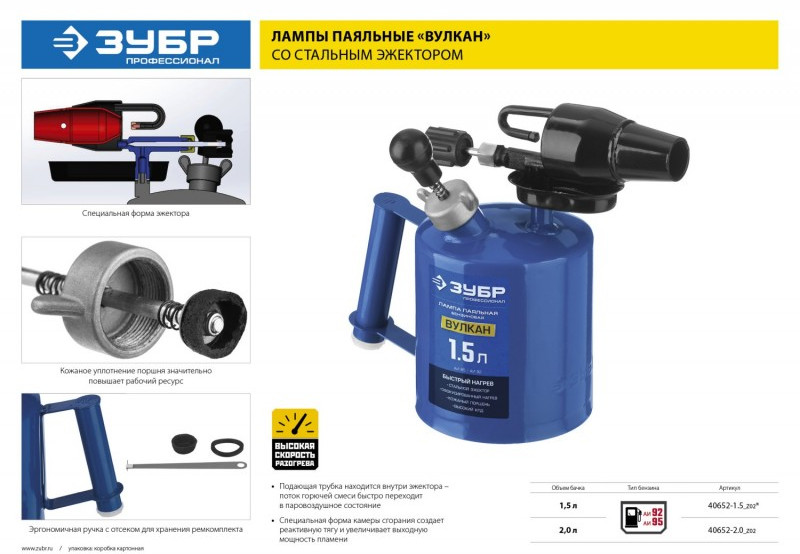 Лампа проста по конструкции, удобна и надежна в эксплуатации. Отличается высокой скоростью разогрева, длительным временем работы на одной заправке. Применяется для нагрева до высокой температуры различных деталей