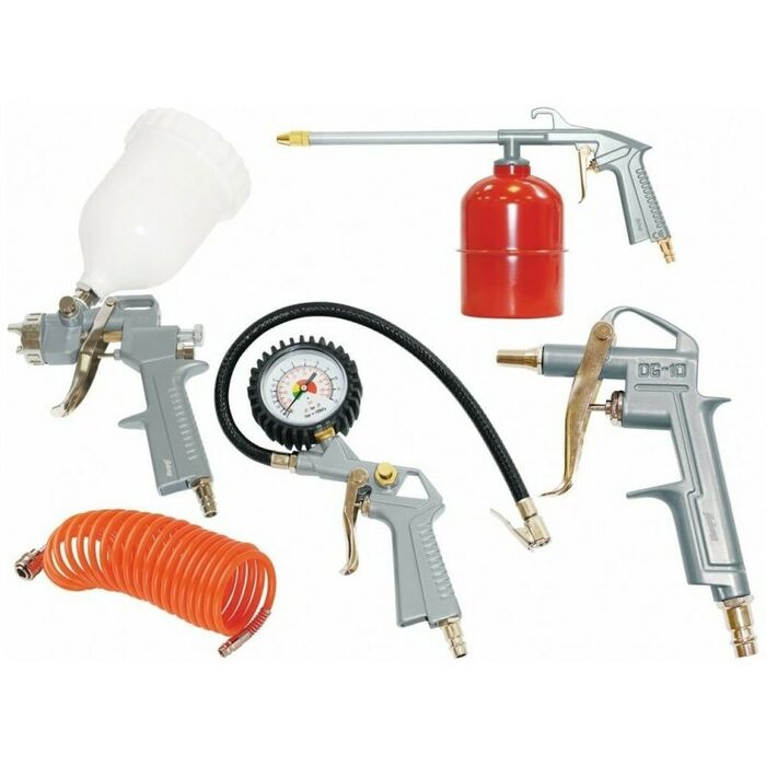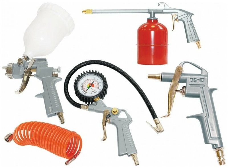 - Гарантийный талон, краскопульт для вязких жидкостей, краскопульт с верхним бачком, пневмопистолет для накачки шин с манометором, пневмопистолет для продувки, спиральный шланг длиной 5 м, упаковка.