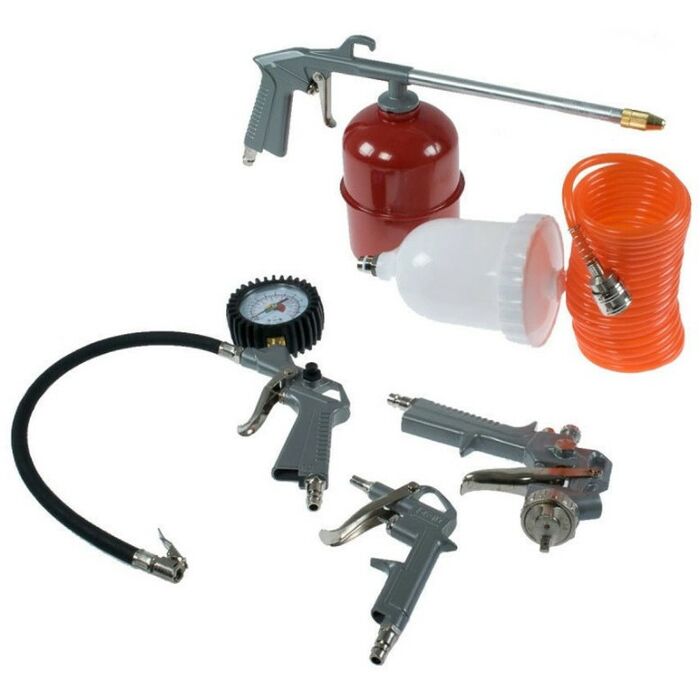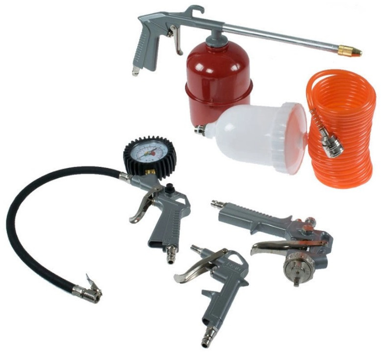 - Набор пневмоинструментов QUATTRO ELEMENTI 771-138 отличается высоким качеством исполнения и, соответственно, долгим сроком службы. Спиральный пневмошланг длиной 5 м обеспечивает стабильную работу инструмента на удалении от питающего компрессора. В комплект поставки входят пистолет с манометром для накачивания шин, обдувочный пистолет для быстрого удаления грязи, краскопульт и пистолет для мовиля для равномерного и аккуратного покрытия поверхности спецсоставами.