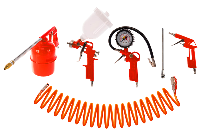 | Комплектация | Краскопульт; пистолет для вязких жидкостей; пистолет для продувки; пистолет для накачки шин; спиральный шланг; насадка удлинитель пистолета для продувки (19 см). |