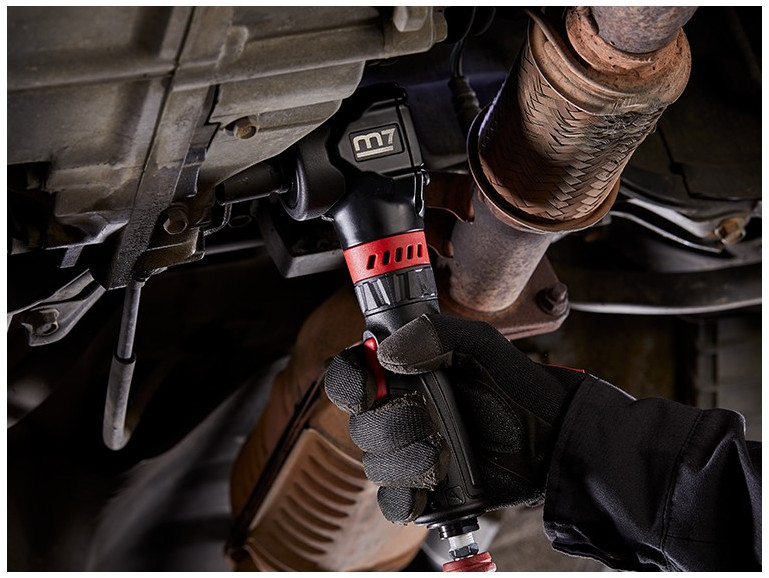• Особенности: Гайковерт оснащен специальным редуктором углового типа, благодаря которому инструмент имеет угловой тип корпуса и малый размер по оси. Возможность регулировки направления выпуска воздуха.