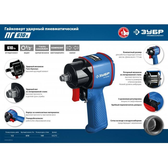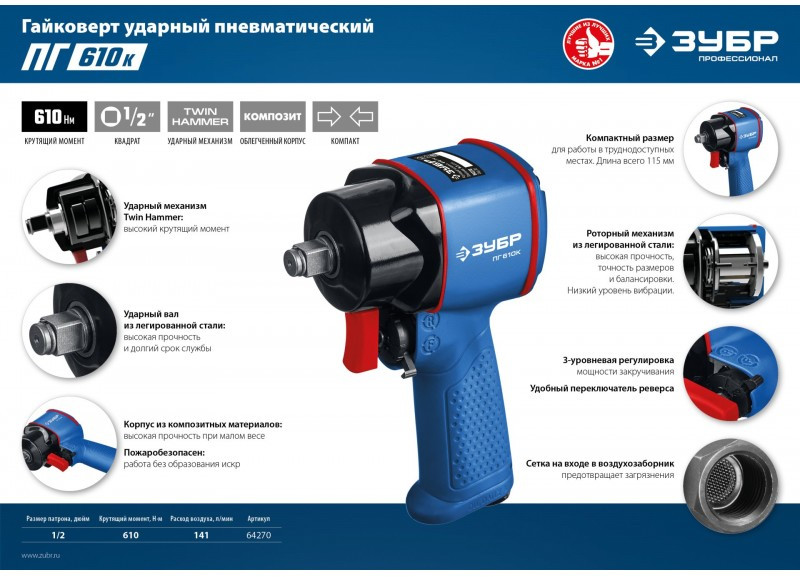 - Профессиональный пневматический гайковерт. Компактные размеры (так называемый, ″мини″) позволяют работать в труднодоступных местах. Благодаря конструкции внутреннего механизма, инструмент развивает высокий крутящий момент без уменьшения рабочего ресурса