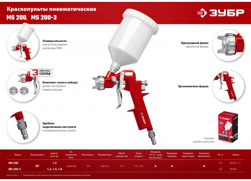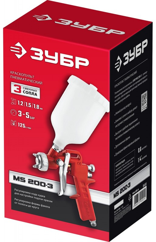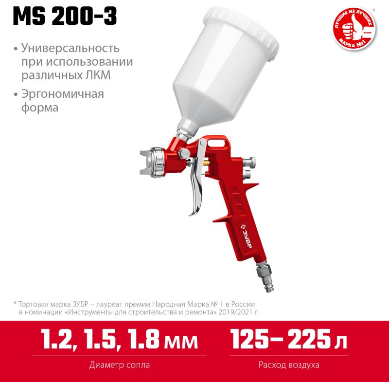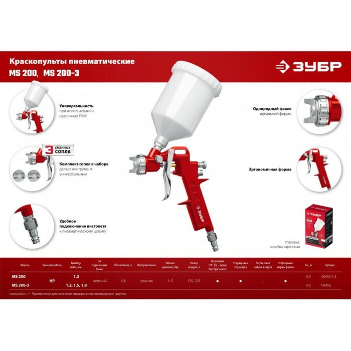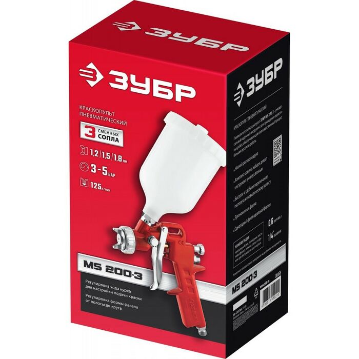 Краскопульт ЗУБР МС 200+ пневматический - универсальный надежный инструмент для проведения окрасочных работ, обеспечивающий производственный процесс большим ресурсом работы.