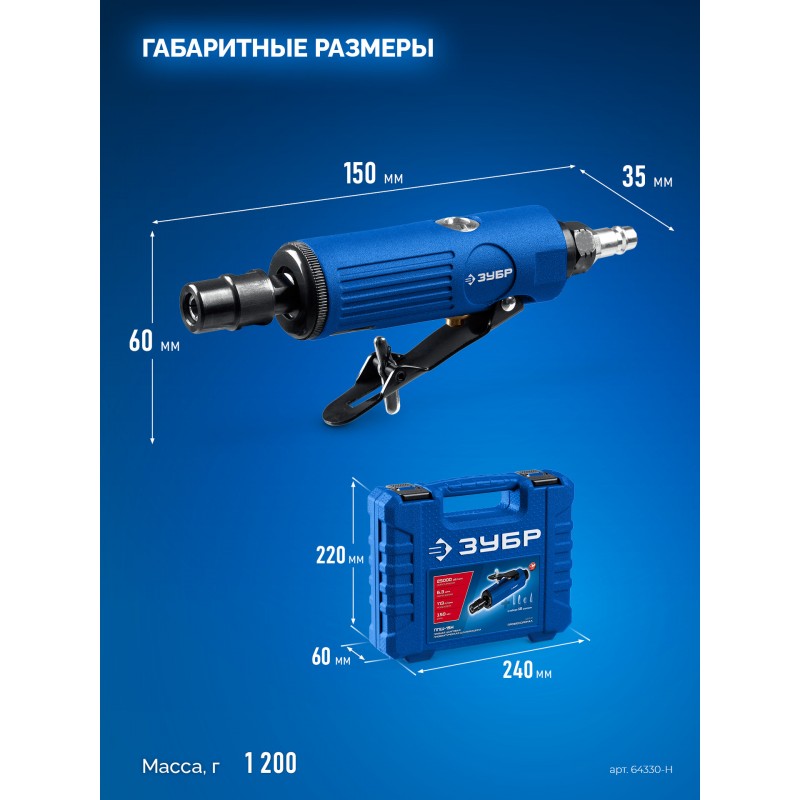 Прямая цанговая пневмошлифмашина Зубр 64330-H набор в кейсе: 10 шарошек и оснастка, ПРОФЕССИОНАЛ