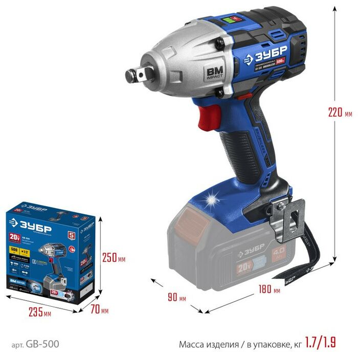 Бесщеточный гайковерт Зубр Профессионал GB-500 Т7, 20 В, 500 Н·м, без АКБ