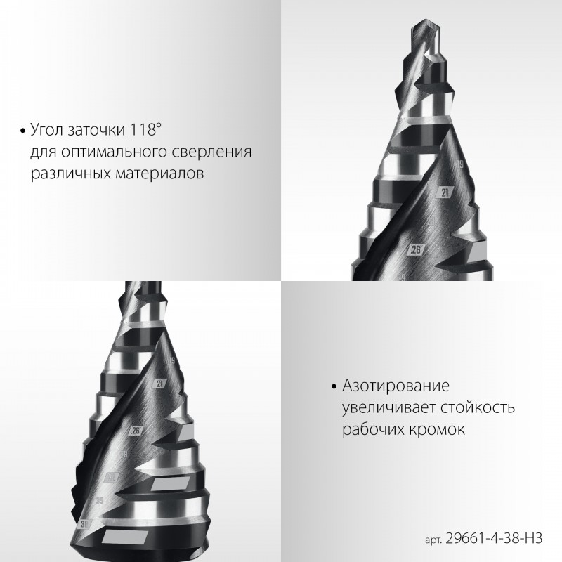 | Комплектация, шт | 4 - 20, 9 ступеней: 4,6,8,10,12,14,16,18,20мм, 4 - 32, 14 ступеней: 4,6,8,10,12,14,16,18,20,22,24,26,28,30,32мм, 6-38 мм, 12 ступеней: 6,9,13,16,19 |