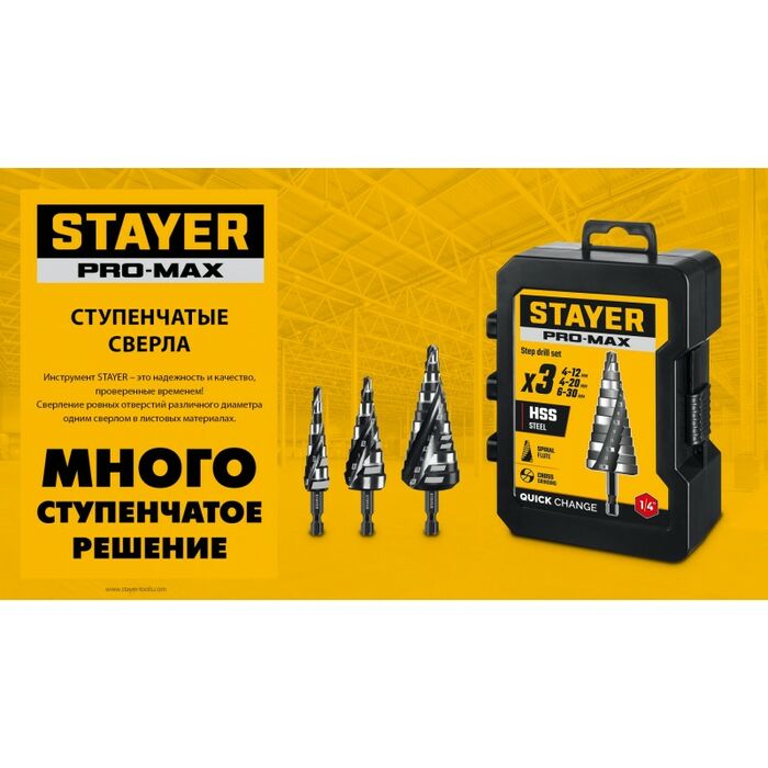 Выбирайте инструмент STAYER и убедитесь в его надежности и высоком качестве, проверенных временем! Сверление ровных отверстий различного диаметра теперь возможно всего одним сверлом.