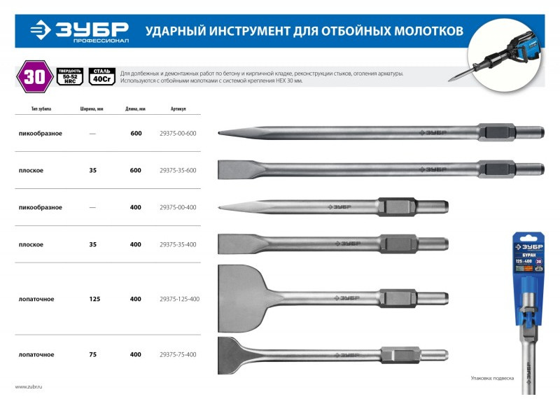 Зубила ЗУБР - ударный инструмент высокого качества и надежности обладающий высокой стойкостью к любым нагрузкам. Преимущества Индукционная...
