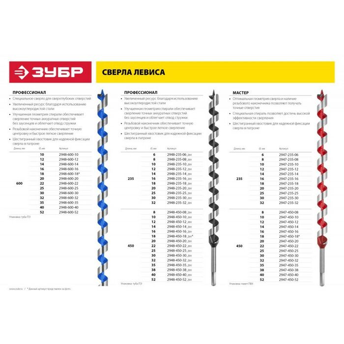 сверло левиса по дереву Зубр 32x450/360мм шестигранный хвостовик [2947-450-32]