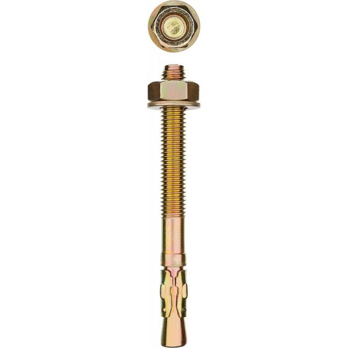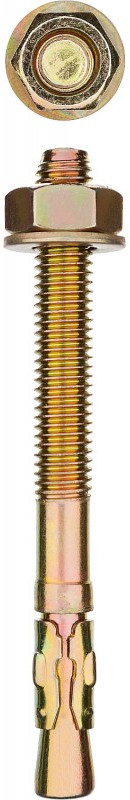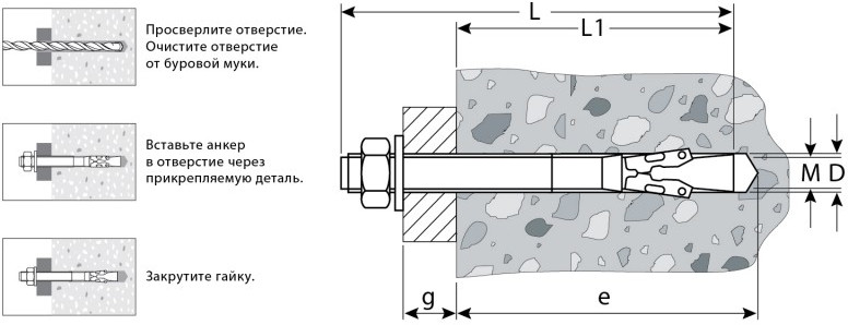 Для монтажа конструкций к полнотелым основаниям: поверхностям из бетона, полнотелого кирпича или природного камня. Анкер устанавливается в предварительно просверленное и очищенное от буровой муки отверстие и расклинивается при закручивании гайки