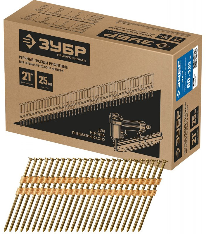 Реечные гвозди соединены в кассету под углом 21° и устанавливаются при помощи гвоздезабивного пистолета (нейлера). Рифленая поверхность гвоздей оптимально подходит для монтажа деревянных конструкций. Использование нейлера обеспечивает высокую скорость монтажа и удобство в работе.