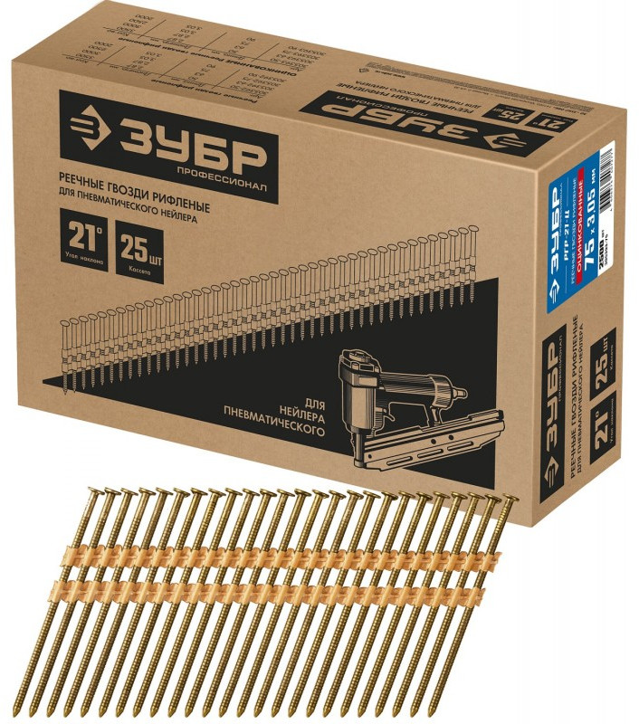 - Использование. Для сборки деревянных конструкций, крепления тонколистового металла до 0.9 мм. Монтаж производится при помощи гвоздезабивного пистолета (нейлера) ЗУБР П21-90 (арт. 31931) или аналогичного, рассчитанного на работу с гвоздями в кассетах с углом наклона 21 град.
