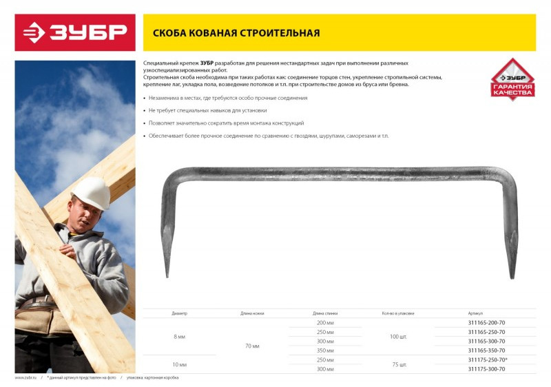 - Строительные скобы незаменимы в местах, где требуется высокая прочность соединения. Скобы используются для сборки деревянных конструкций при строительстве домов, устройстве крыш и т.п. Длина ножки скобы составляет 70мм.