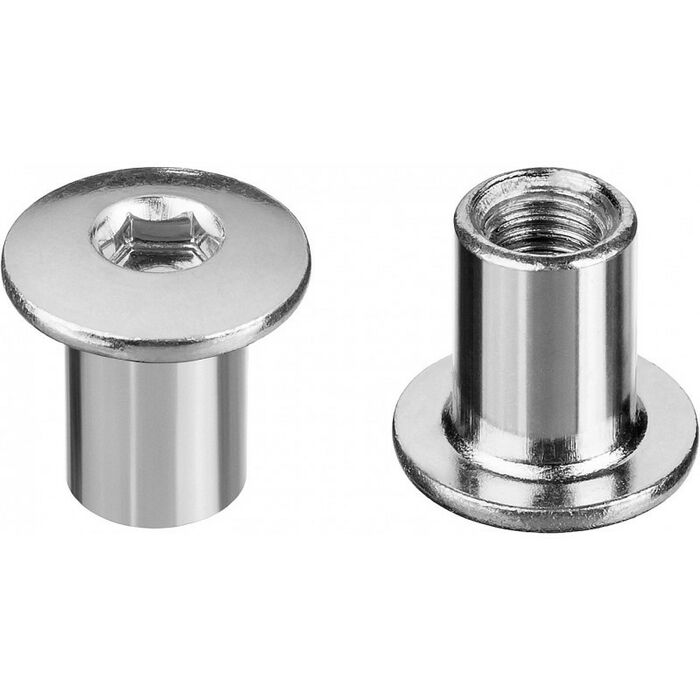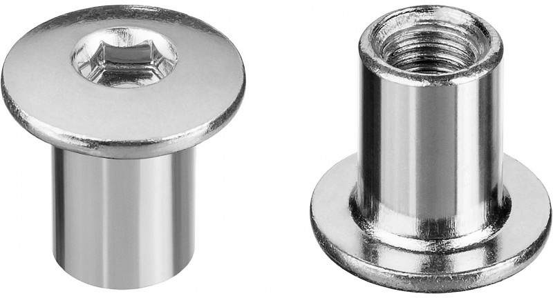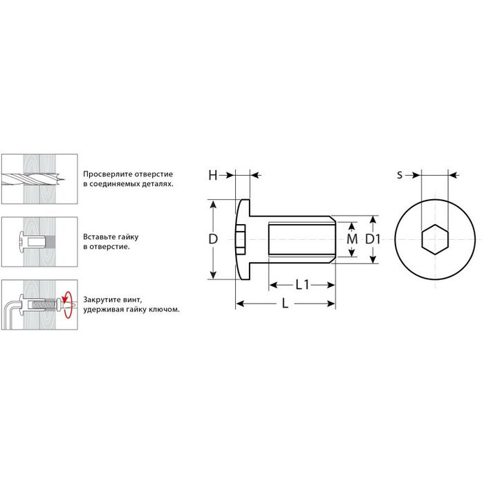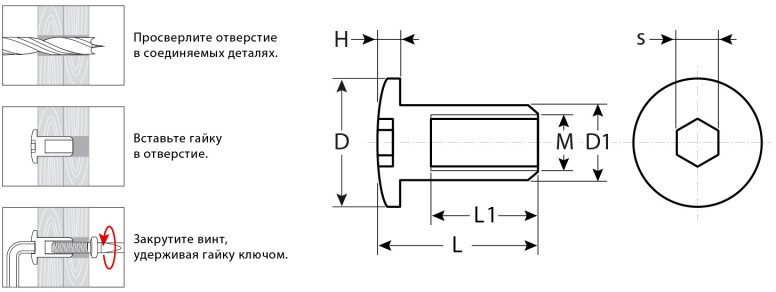 - Использование. Для создания разъемного резьбового соединения в мебельном производстве, стяжки деталей и конструкций. Гайка устанавливается в заранее подготовленное отверстие, равное или чуть больше внешнего диаметра гайки. Фиксация гайки происходит при помощи винта с метрической резьбой. Для затягивания соединения используется торцевой шестигранный ключ.