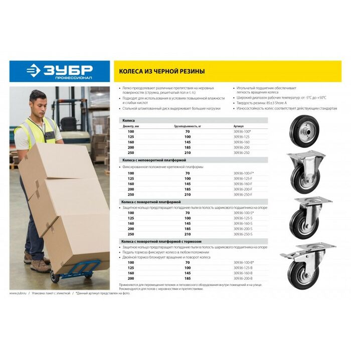 Колесо Зубр Профессионал d=250 мм г/п 210 кг, резина/металл, игольчатый подшипник [30936-250]