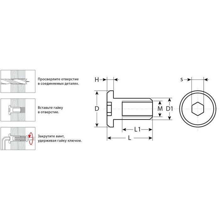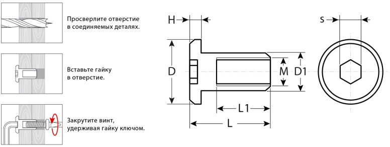 - Использование. Для создания разъемного резьбового соединения в мебельном производстве, стяжки деталей и конструкций. Гайка устанавливается в заранее подготовленное отверстие, равное или чуть больше внешнего диаметра гайки. Фиксация гайки происходит при помощи винта с метрической резьбой. Для затягивания соединения используется торцевой шестигранный ключ.