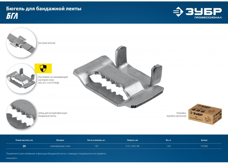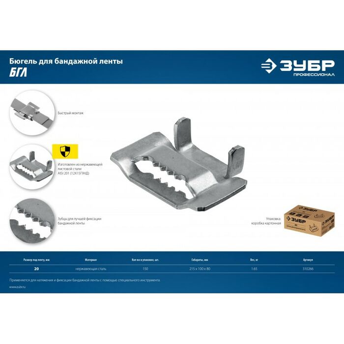 Бюгель для бандажной ленты Зубр Профессионал 20мм 150 шт, нержавеющий, БГЛ [310266]