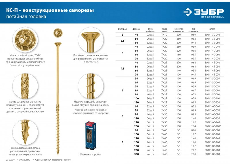 Конструкционные саморезы обладают высокой прочностью и пластичностью, благодаря чему не разрушаются при деформациях и изгибе. Режущая кромка на острие, точная геометрия резьбы и специальная фреза значительно облегчают вкручивание самореза и предотвращают растрескивание древесины.