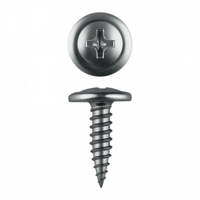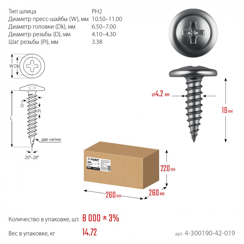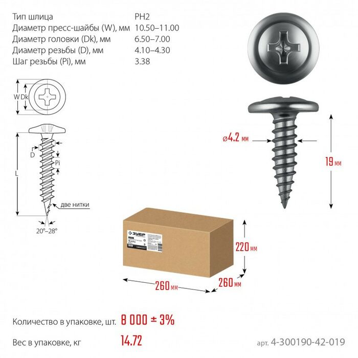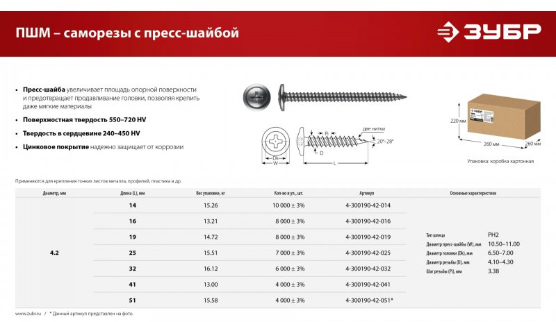 Саморезы с пресс-шайбой для листового металла изготовлены из стального прутка с высоким содержанием углерода. Контроль за геометрией самореза начинается с калибровки прутка и заканчивается тщательной проверкой размеров готового изделия. Нормативная твердость стали достигается термической обработкой. Поверхностная твердость 550-720HV, твердость в сердцевине 240-450HV. Саморезы легко вкручиваются обычным шуруповертом или отверткой с крестообразным шлицем PH2 (DIN). Предварительное сверление в скрепляемых материалах не требуется. Геометрические размеры: диаметр пресс-шайбы (W) - 10.5-11.0мм, диаметр головки (Dk) - 6.5-7.0мм, диаметр резьбы (D) - 4.1-4.3мм, шаг резьбы (Pi) - 3.38мм.