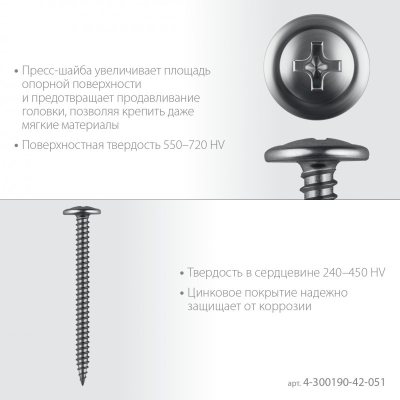 - Пресс-шайба увеличивает площадь опорной поверхности и предотвращает продавливание головки, благодаря чему саморезами можно крепить даже мягкие материалы.