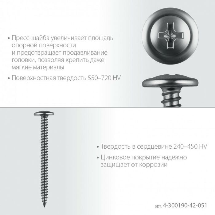 Нормативная твердость стали достигается термической обработкой. Поверхностная твердость 550-720HV, твердость в сердцевине 240-450HV. Саморезы легко вкручиваются обычным шуруповертом или отверткой с крестообразным шлицем PH2 (DIN).