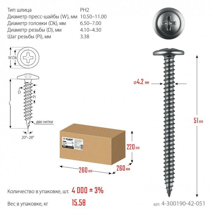 - Диаметр резьбы (D), мм: 4.10-4.30