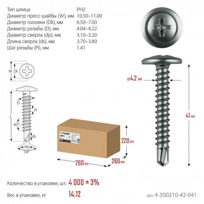 Предварительное сверление в скрепляемых материалах не требуется. Геометрические размеры: диаметр пресс-шайбы (W) - 10.5-11.0мм, диаметр головки (Dk) - 6.5-7.0мм, диаметр резьбы (D) - 4.04-4.22мм, диаметр сверла (dp) - 3.1-3.2мм, длина сверла (ds) - 3.7-3.8мм, шаг резьбы (Pi) - 1.41мм.