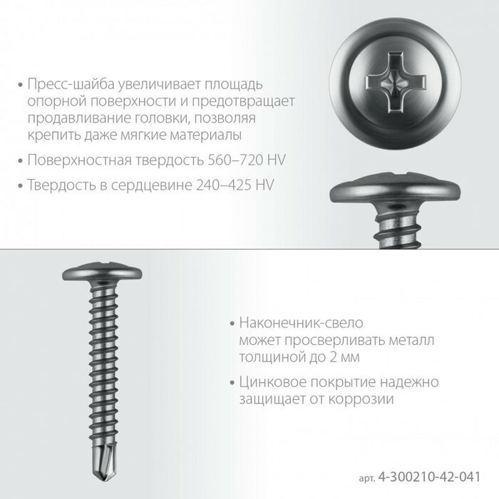 - Пресс-шайба увеличивает площадь опорной поверхности и предотвращает продавливание головки, благодаря чему саморезами можно крепить даже мягкие материалы.