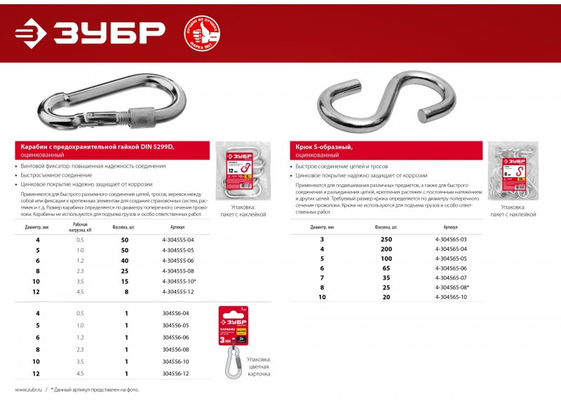Для быстрого разъемного соединения цепей, тросов, веревок между собой или фиксации к крепежным элементам для создания страховочных систем, растяжек и т.д.. Размер карабина определяется по диаметру поперечного сечения проволоки. Карабины не используются для подъема грузов и особо ответственных работ.