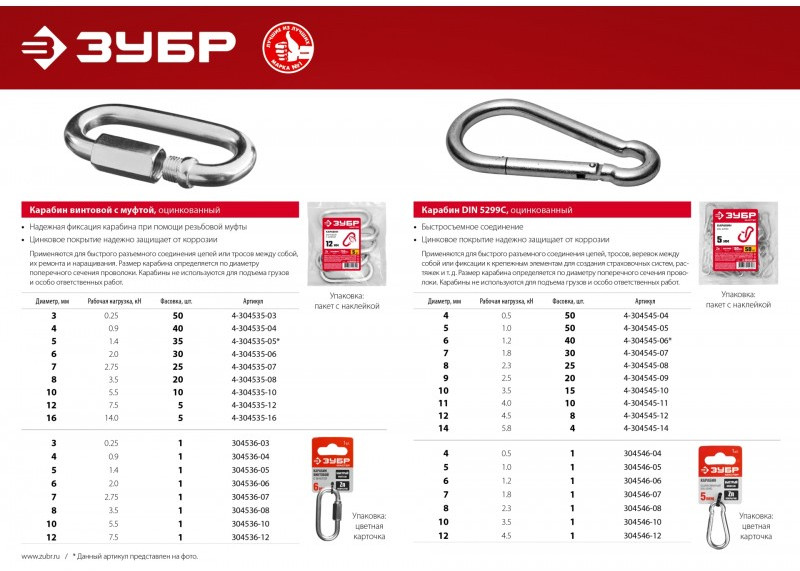 Для быстрого разъемного соединения цепей, тросов, веревок между собой или фиксации к крепежным элементам для создания страховочных систем, растяжек и т.д.. Размер карабина определяется по диаметру поперечного сечения проволоки. Карабины не используются для подъема грузов и особо ответственных работ.
