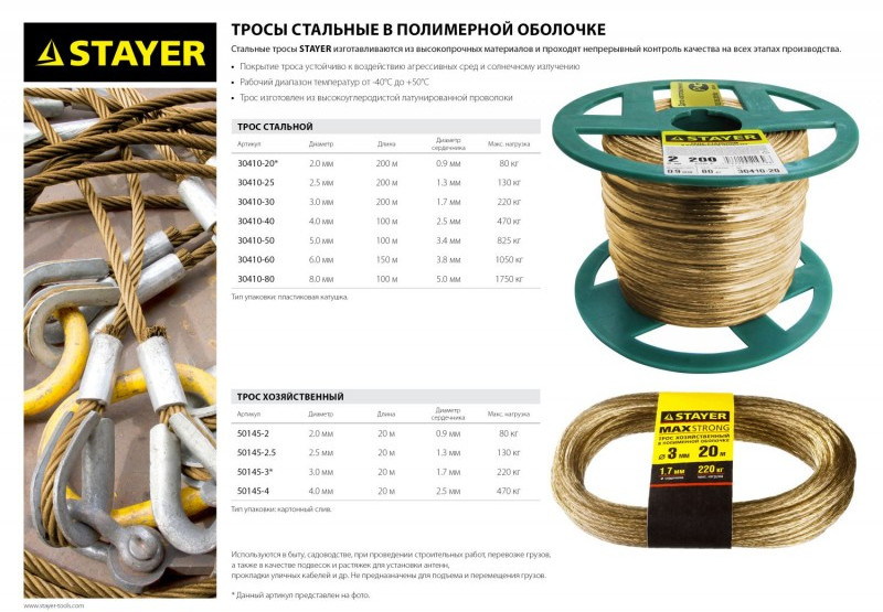 Стальные тросы STAYER в полимерной оболочке изготовлены из прочных материалов и применяются во многих сферах жизнедеятельности человека.