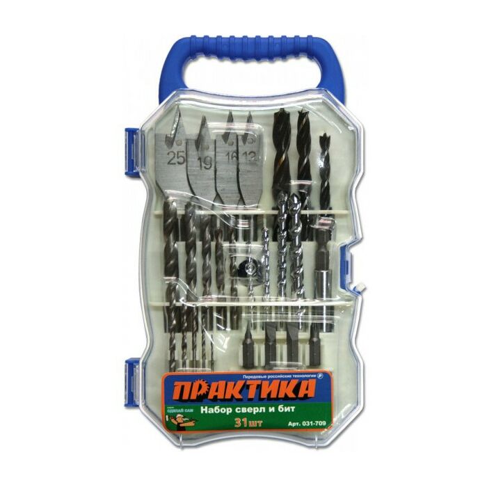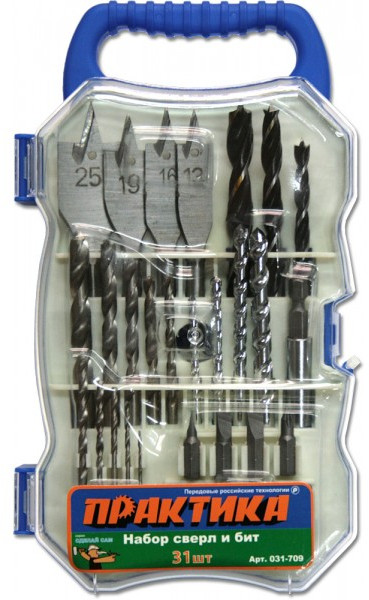 - Общий состав набора: биты 9 шт., магнитный держатель для бит, сверла 21 шт.