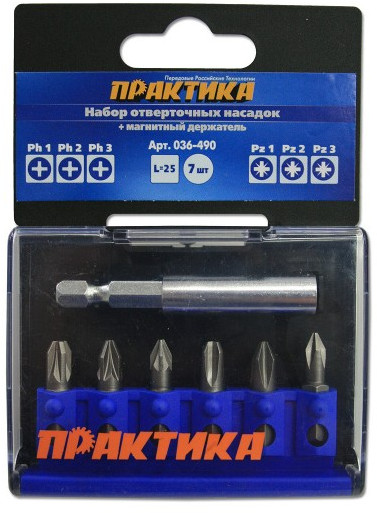 Набор бит Практика 036-490 7шт, ПРОФИ, РН1,2,3, PZ1,2,3х25мм, магнитный держатель