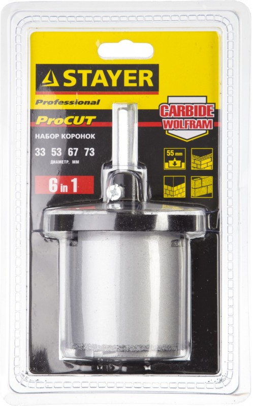 Набор кольцевых коронок STAYER 33345-H6 6 шт: 33, 53, 67, 73 мм, карбид вольфрама [33345-H6]