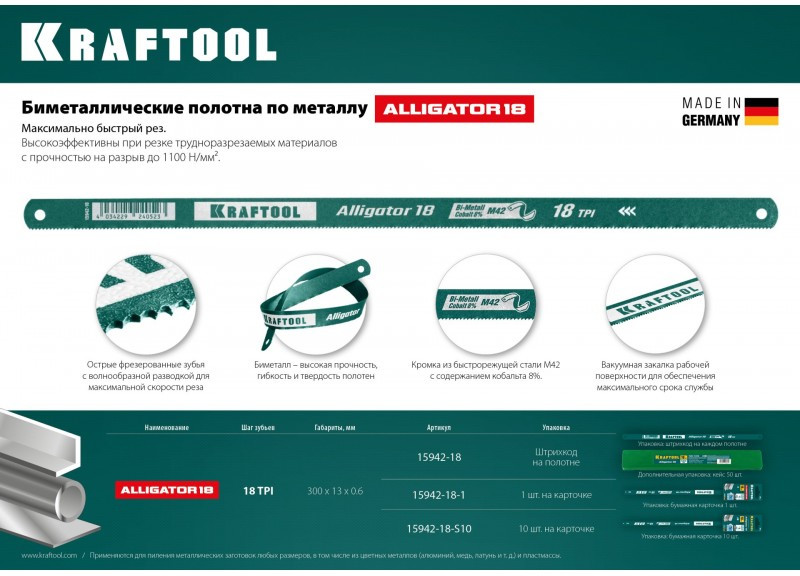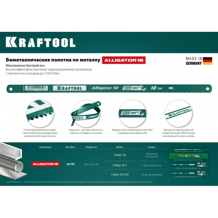 • Биметаллическое полотно KRAFTOOL применяется для пиления металлических заготовок с повышенной твер-достью. Универсальный шаг зубьев можно использовать для пиления крупногабаритных заготовок.