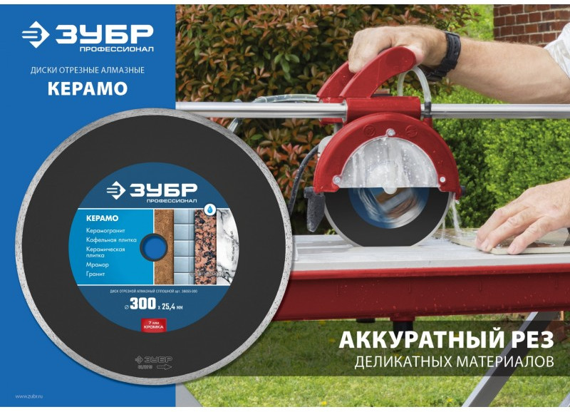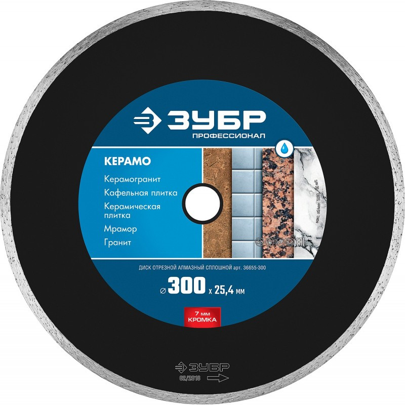 Диск алмазный отрезной Зубр Профессионал КЕРАМО-25 300 мм 25.4 мм, 7 х 3.2 мм, сплошной по керамограниту, мрамору, плитке [36655-300]