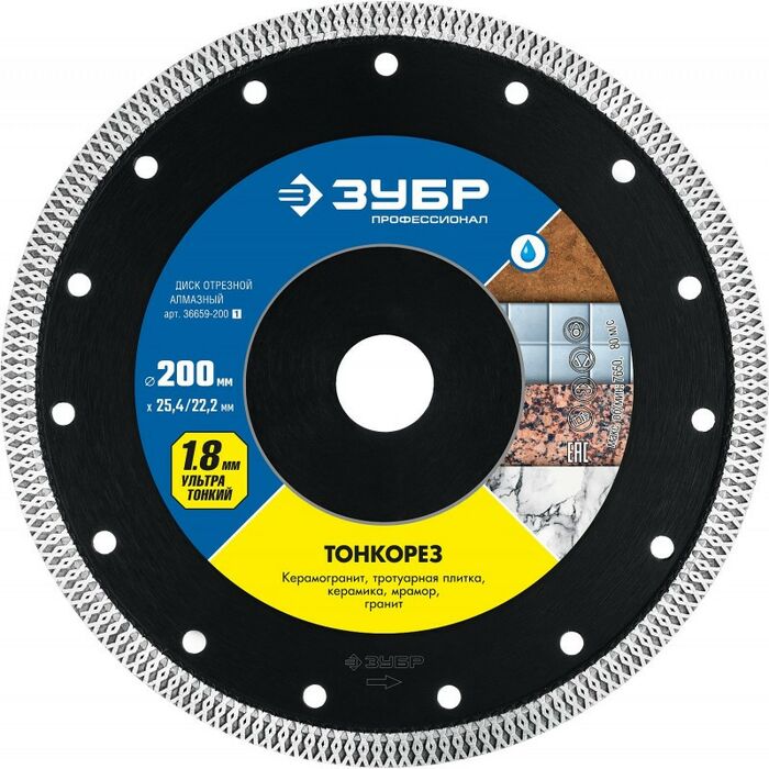 Ультратонкий алмазный диск по керамограниту Зубр Профессионал ТОНКОРЕЗ 200 мм [36659-200_z01]